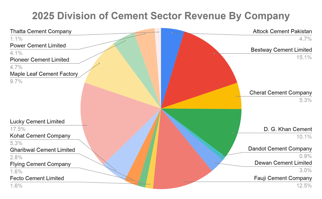 The Chart (Revenue 1) of the sector shows that in the last 5 years that the combined revenue of all the companies currently listed in the stock exchange’s cement sector has not only risen at a dependable rate but also nearly doubled since 2021. However, if we take a closer look, at the individual revenues generated by these companies (Revenue 2). We will clearly see that the majority of these revenues are by single big players such Bestway Cement, Lucky Cement and Fauji Cement, D.G.Khan Cement and Maple Leaf Cement. All of these are contributing to a total of Rs. 712.4 billion in Sector revenue, most of which is internationally exported and received in foreign currency. This is what is providing us with the growth