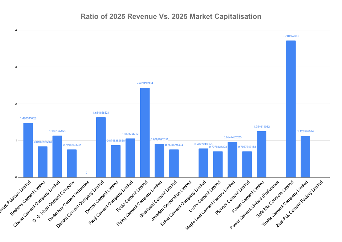 It is a surprising comparison when it comes to revenue contribution vs. market capitalization in the cement sector of Pakistan. As the top most companies in Market capitalization are contributing on a lower ratio than their less capitalized counterparts. Here smaller companies are outcompeting their larger, more established counterparts. Here Safe Mix Concrete is leading the charge followed by Fector Cement Company and then by Dandot Cement Company Limited. This becomes evident in the following table.