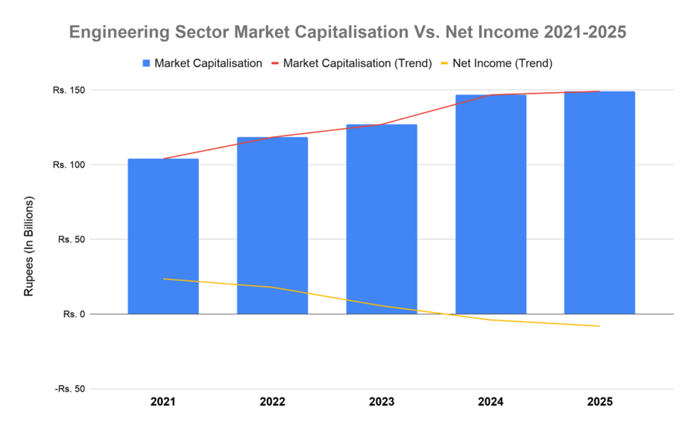 Market capitalization should ideally track fundamental performance; however, the Pakistani steel sector presents a profound economic paradox. While net income and ROE have plummeted, the Grand Total Market Capitalization has risen from Rs. 103.92 billion (2021) to a projected Rs. 149.11 billion (2025).