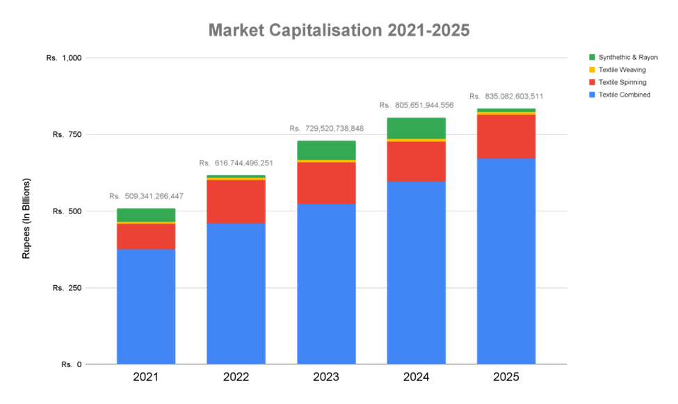 The Textile Combined sector saw revenue surge from Rs. 716.16 billion in 2021 to a peak of Rs. 1.45 trillion in 2024/2025— a doubling of the top line. However, the market has not rewarded this scale. While Market Capitalization for the combined sector reached Rs. 672.69 billion in 2025, the Synthetic & Rayon sector experienced a catastrophic valuation collapse, plummeting from a 2024 peak of Rs. 69.56 billion to a mere Rs. 10.89 billion by 2025. As seen in chart Revenue 1.