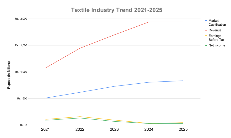 Between 2021 and 2025, the sector exhibited a deceptive macro-trend: massive revenue expansion set against severe economic headwinds. From an equity research perspective, this top-line growth represents "inflationary pass-through" and currency-driven bloating rather than organic operational health. As the Pakistani Rupee devalued, export-oriented revenues expanded nominally, but this has failed to translate into proportional shareholder value.