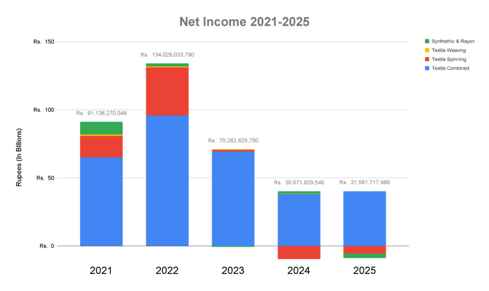 - Textile Spinning: This segment experienced a total loss of pricing power, swinging from a peak profit of Rs. 35.25 billion in 2022 to a staggering net loss of Rs. 9.57 billion in 2024. See chart Net Income 2.