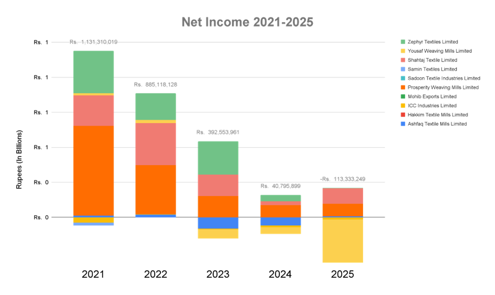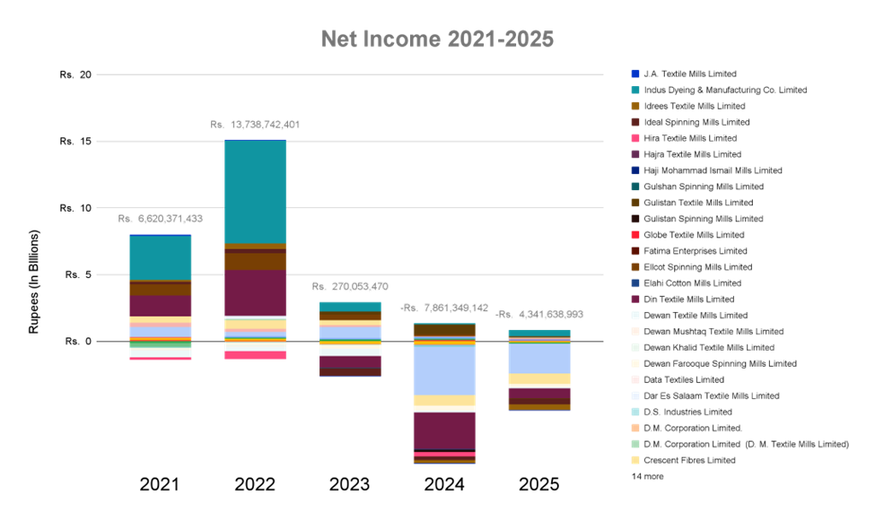 The industry is currently grappling with a "Profitability Paradox." The sector has transitioned from the "Golden Year" of 2022, which saw record-high net incomes, to a regime of operational deficits. Despite the 100% revenue growth in Textile Combined since 2021, absolute Net Income for the segment contracted by 58% from its 2022 peak (Rs. 95.76 billion) to 2025 (Rs. 40.28 billion). This is seen in Net Income 1.