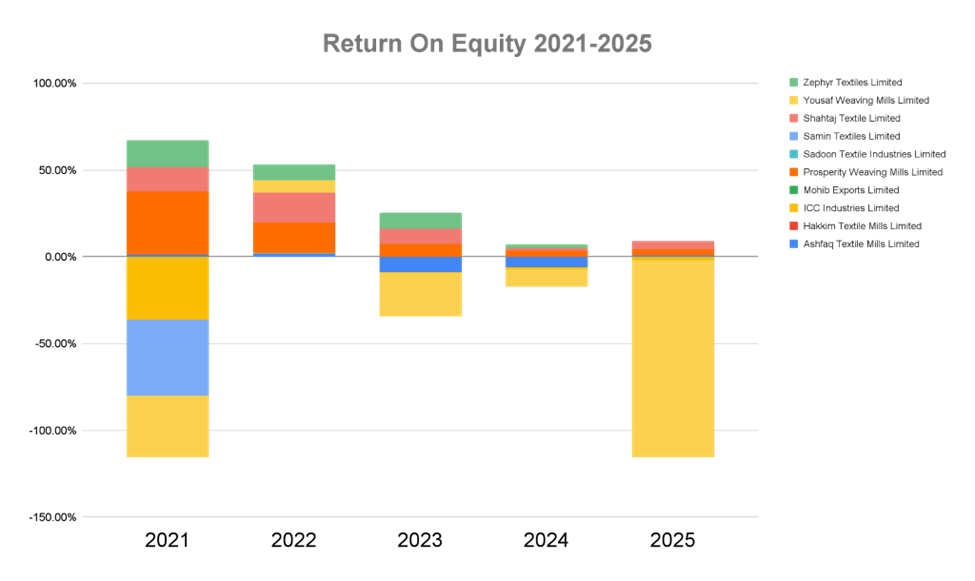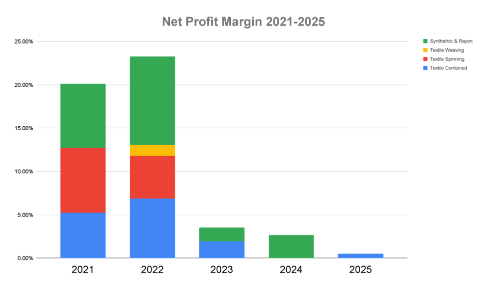 The ROE across the sector has effectively collapsed. Textile Spinning, which provided a 7.49% return in 2021, and Textile Weaving, which sat at 1.28% in 2022, have both reported 0.00% ROE throughout the 2023–2025 period. In research terms, a "0.00%" ROE in a high-inflation environment is not a neutral performance; it represents massive capital destruction and a total impairment of shareholder equity. For these details refer to charts ROE 1 & ROE 2.